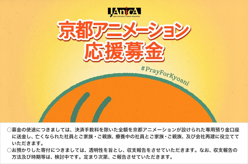 2019年7月18日におきた株式会社京都アニメーション第一スタジオに対する放火事件で被災された京都アニメーションや従業員等の方々のための支援募金が、日本アニメーター・演出協会(JAniCA)の立ち上げとYahoo!の協力によりスタートしました。